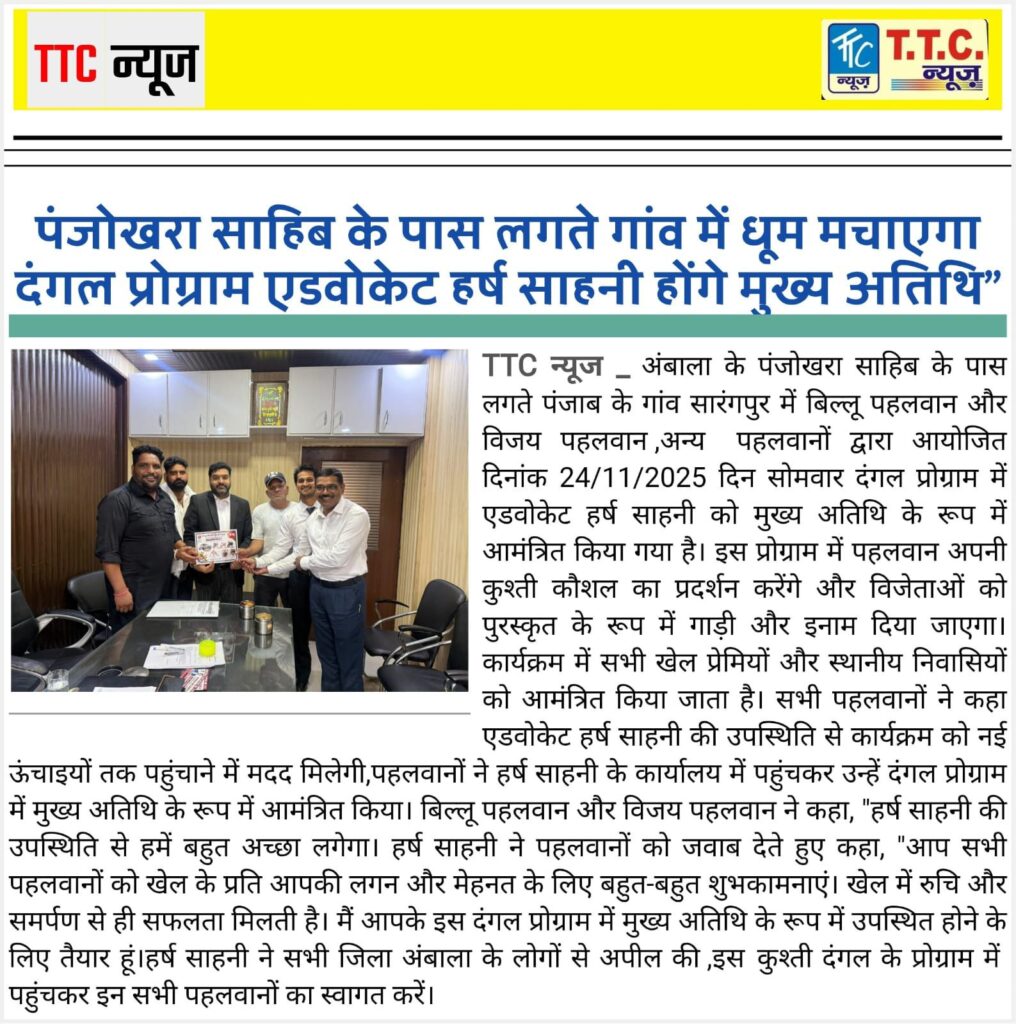 पंजोखरा साहिब के पास लगते गांव में धूम मचाएगा दंगल | मुख्य अतिथि – एडवोकेट हर्ष साहनी administrator 30/10/2025 0 Comments You Might Also Like हरियाणा दिवस पर एडवोकेट हर्ष साहनी का शुभकामना संदेश | हमारा हरियाणा हरियाली और खुशी से भरा रहे 01/11/2025 दशहरे पर अंबाला मानव चौक मानव रंगमंच में मुख्य अतिथि के रूप में परिवार सहित पहुंचे समाज सेवी ऐडवोकेट हर्ष साहनी 30/09/2025 सर्दियों में पुलिसकर्मियों के लिए लगाया जाएगा चाय का लंगर : हर्ष साहनी 22/10/2025 Leave a Reply Cancel reply Save my name, email, and website in this browser for the next time I comment.